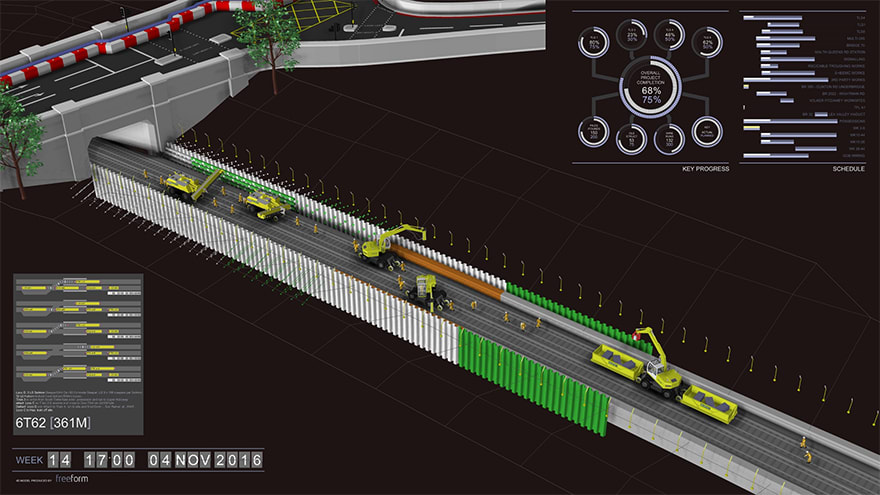 A detailed 4D model simulating civil construction works and train movements along a 14-mile section of railway, between Gospel Oak and Barking, is helping Network Rail pro-actively manage the £133m construction programme.