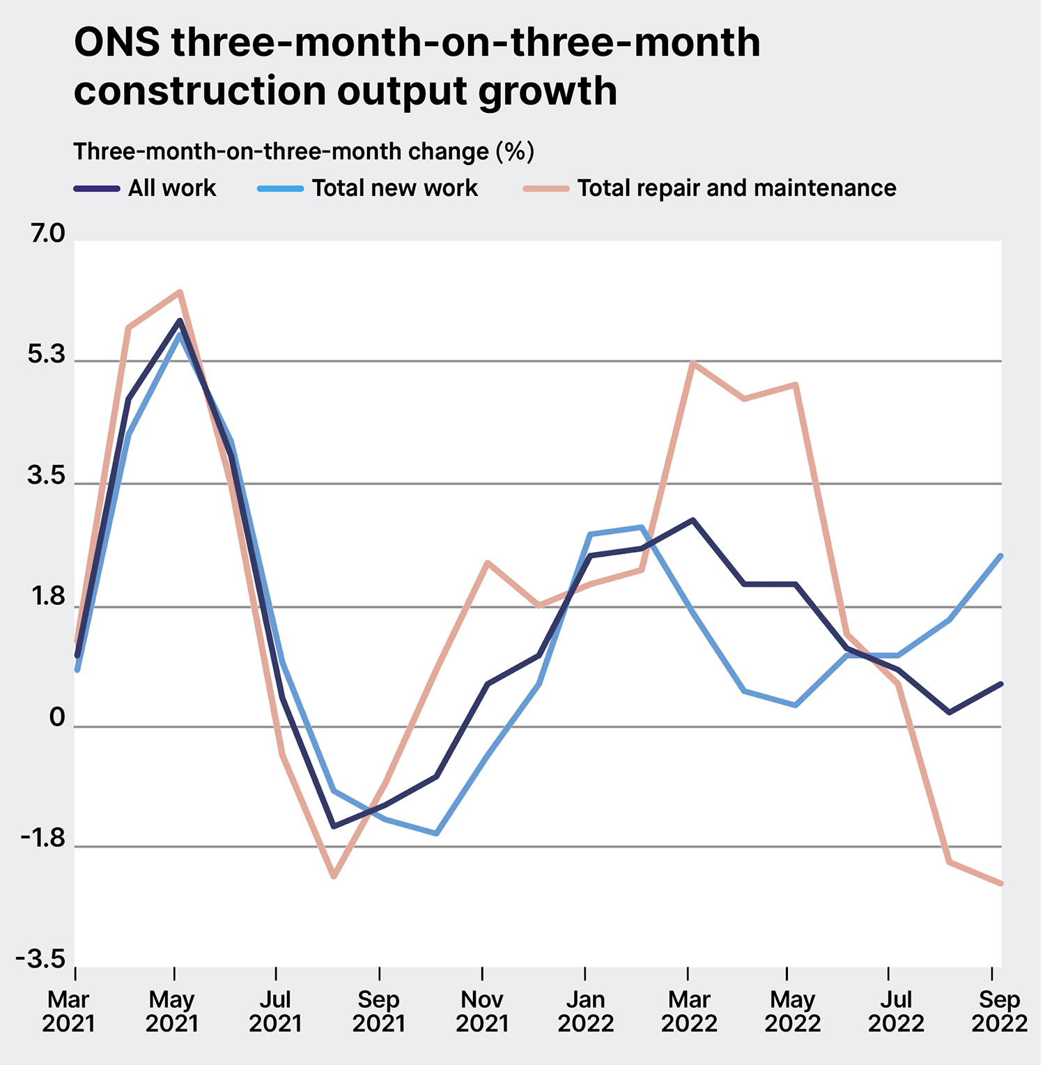 Construction output growth has been slowing since February, with supply chain disruption and inflation continuing to act as a drag on activity levels. Data from the Office for National Statistics shows that all work construction output growth increased by just 0.6% in September 2022, having steadily fallen from 2.9% growth in the three months to March 2022. This has largely been driven by a fall in repair and maintenance work of 2.2% in September 2022, with these works being delayed or halted due to reduced disposable incomes following heightened food and energy costs.