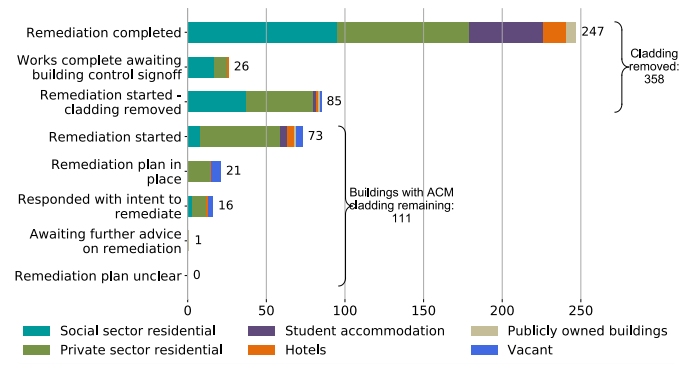 However, the private sector was moving at a slower pace, with 87% of 188 buildings having either completed or started remediation. Of those, 136 buildings (63%) have had their ACM cladding removed.