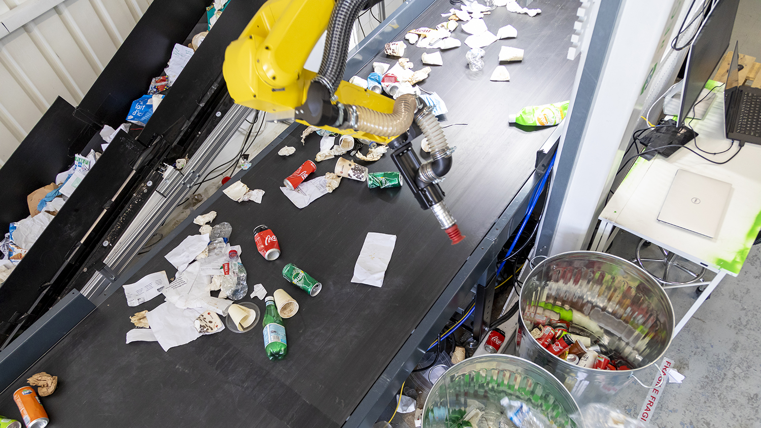 Recycleye uses a mobile phone-quality camera mounted above a waste conveyor belt, which takes photos of the passing waste – 60 photos per second. This information is sent to an algorithm that ranks the items for picking priority, and then sends instructions to the robotic arm, telling it what item to pick and where it is, and where to place it. The system makes 55 picks every minute.