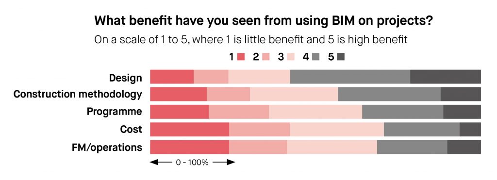 Across the sector, BIM is acknowledged as moderately useful for construction methodology, programming and cost control. In the FM sector, which has historically been slower to adopt BIM than construction, as many as nearly one-third (31%) have found BIM to be useful or very useful on projects.