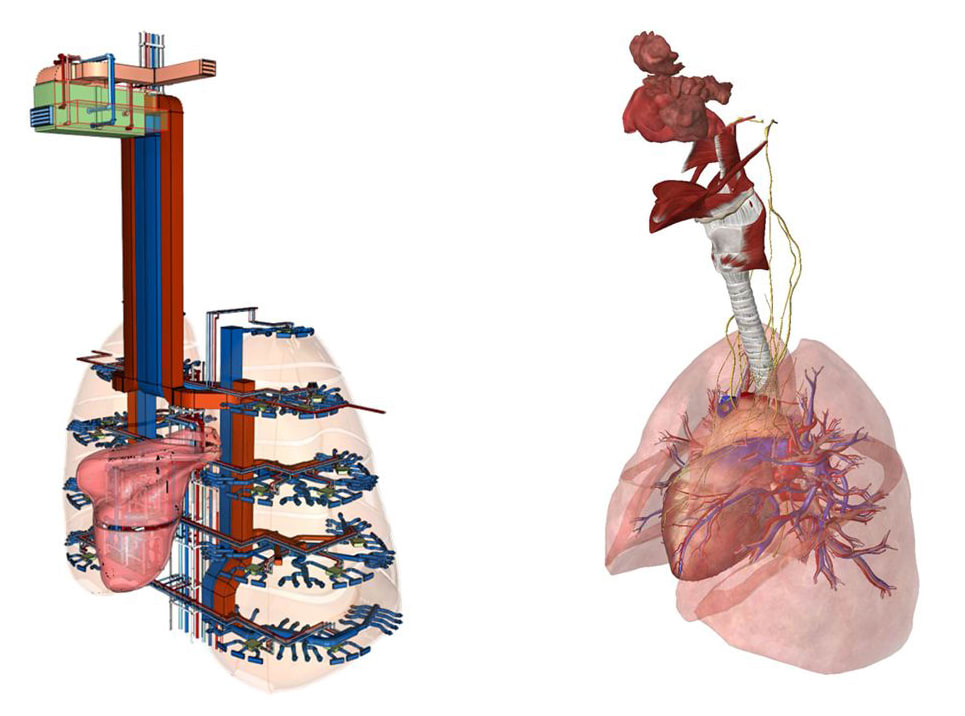 The HVAC system represents the lungs, the pump system the heart and circulatory system, electrical system the nerves and the building management system is the brain, and so on. We’ve put it together with a bit of humour.– Casey Rutland, Arup