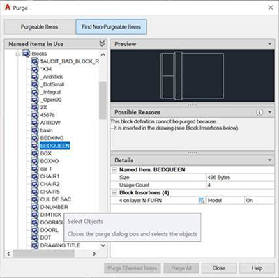 It has now been redesigned, with a preview window, allowing you to quickly assess if something needs purging or not, offering insight into non-purgeable items as to why they cannot be purged and how many there are. The option to zoom in on these elements is also a nice feature.