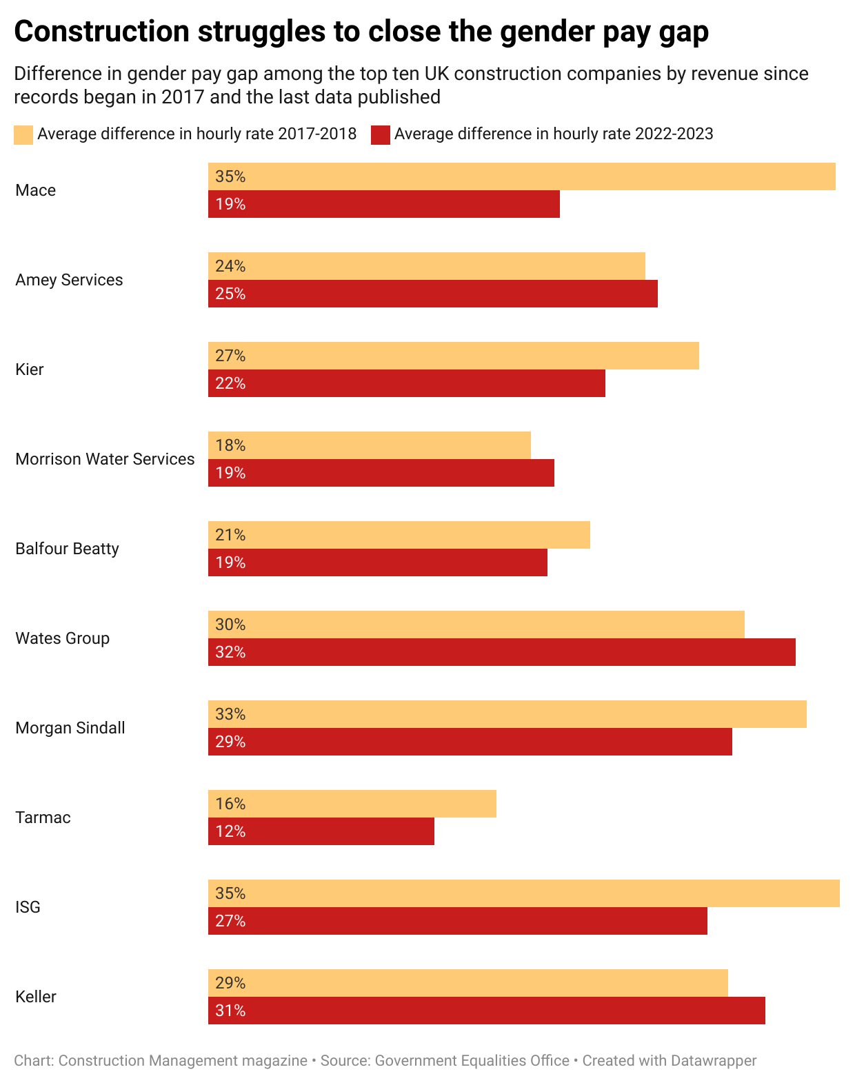 The average difference in hourly rate between men and women working in the biggest construction firms when gender pay gap reporting began in 2017-2018 was 26.57%. Five years on, the average difference is just over three percentage points less at 23.49%.