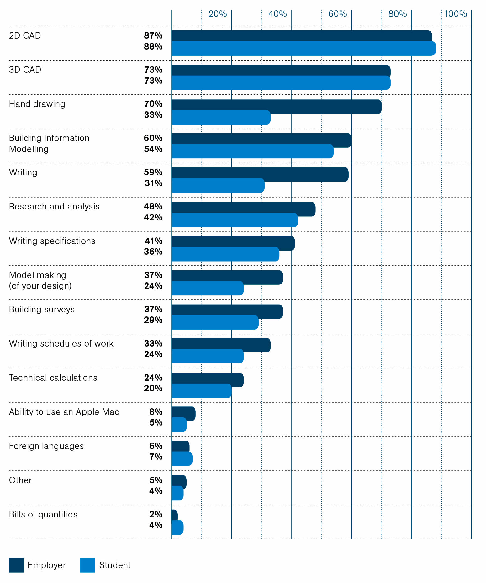 Along with 2D CAD and 3D CAD, a technical knowledge of BIM was rated high as an expected skill by both employees and students with more than half of those asked describing BIM as an “essential technical skill”.