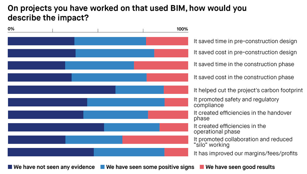 That was compared to 42.8% who said they saw “some positive signs” and 44% who saw no evidence at all. Similarly, only 13.1% saw good results in reducing a project’s carbon footprint using BIM, with 59.9% reporting that they saw no evidence at all that it helped.