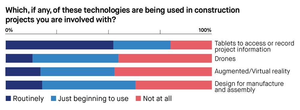 Those who witnessed the routine use of drones and augmented and virtual reality technology on projects they were involved in also increased, to 13% and 16.8% respectively, while there was a slight rise in those who reported their projects as “just beginning to use” the technologies, at 41.8% and 36% respectively (up from 39% and 32.9% last year).