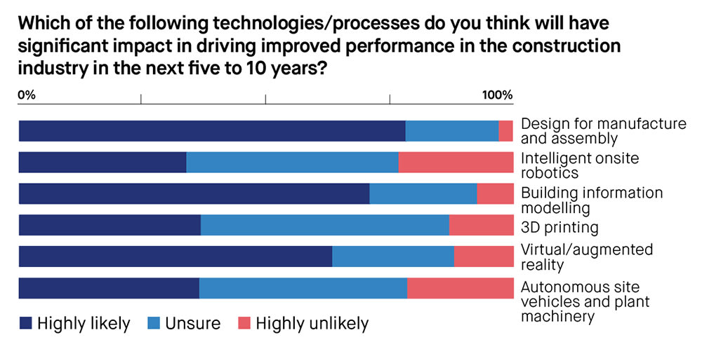 BIM was second most popular option to be chosen as being “highly likely” to have a significant impact on the sector, at 70.9%, with virtual and augmented reality in third at 63.3%.