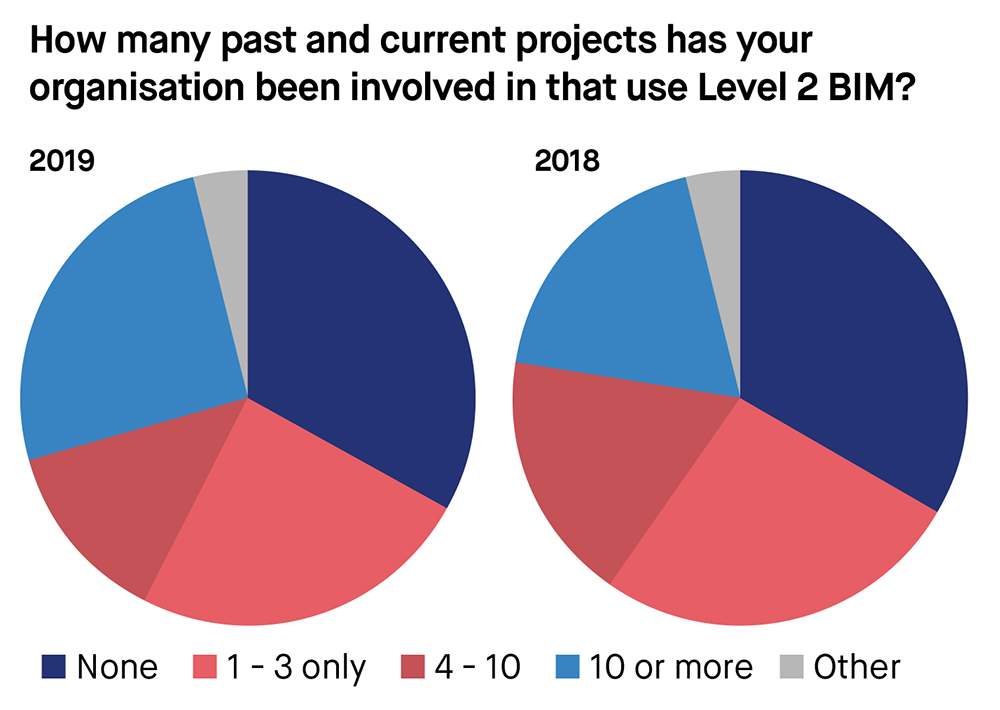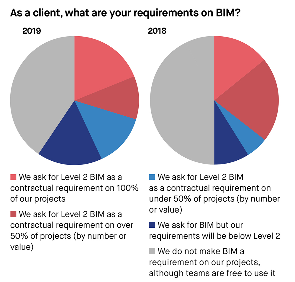 Nearly 19% of all clients said they asked for Level 2 BIM as a contractual requirement on 100% of their projects, which was an increase of nearly five percentage points on 2018, when 14.3% reported doing so.
