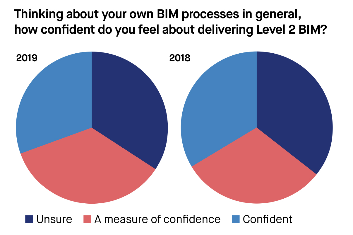 The proportion of respondents who regarded themselves as unsure about how to deliver BIM Level 2 remained broadly the same in 2019 as it did the year before at 34.3%, down slightly from 35.8%. But those who considered themselves confident also dropped slightly, from 33.5% in 2018 to 30.5% this year. That meant that those feeling a “measure of confidence” increased to 35.2% in 2019, up from 30.7%.