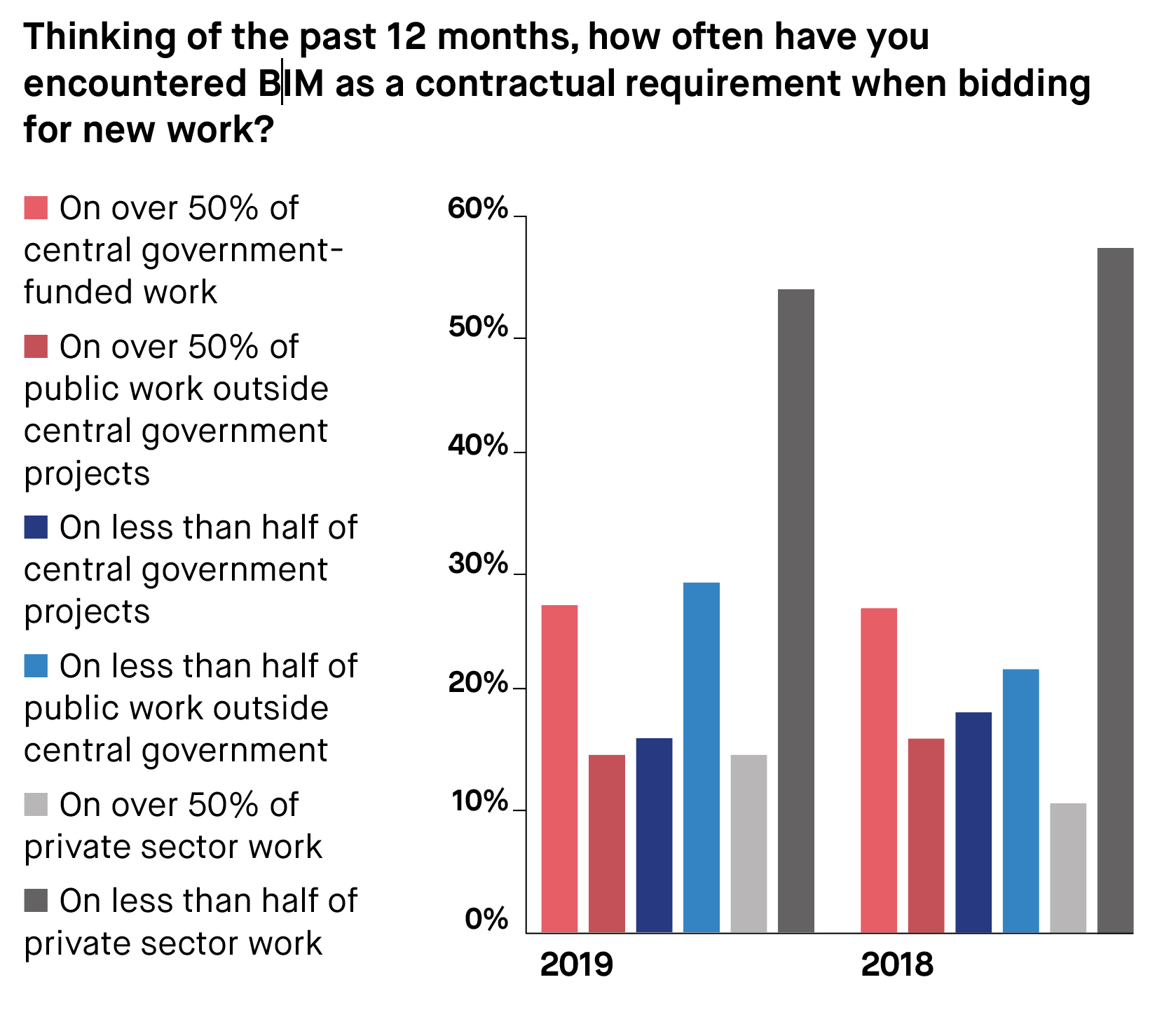 The survey of over 300 built environment professionals, now in its fourth year, recorded a four-percentage-point increase in the number of respondents who said they had encountered BIM as a contractual requirement on over 50% of private sector work when bidding for new projects.