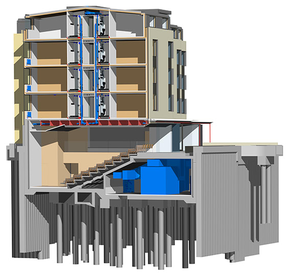 The use of Revit drastically simplified coordination for all involved, says Matthews, notably when resolving MEP inside a complex riser channelling a large number of services from the residential units down through the Institute of Human Rights.