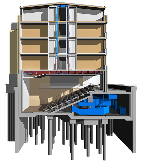 “The new approach to designing buildings has allowed us to offer more 3D views of sections and details which really explain the design intent. However, Revit’s lack of flexibility when making cuts through the model to generate drawings resulted in some unsuitable architectural plans, such as for the lecture theatres where not all the raking seats were included.”