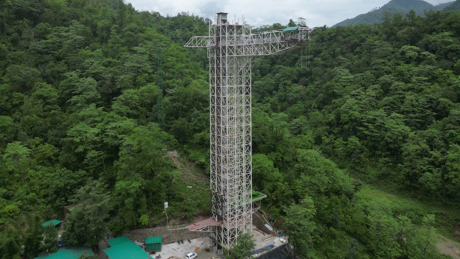 Himalayan Bungy, located within Hikers Adventure Park, blew past this threshold. The tower, which opened to the public last year, sits atop a steep hill with panoramic views of the Ganges. It features a 27m-long boom arm that extends over the slope below, adding the effect of additional height and creating a 107m drop.