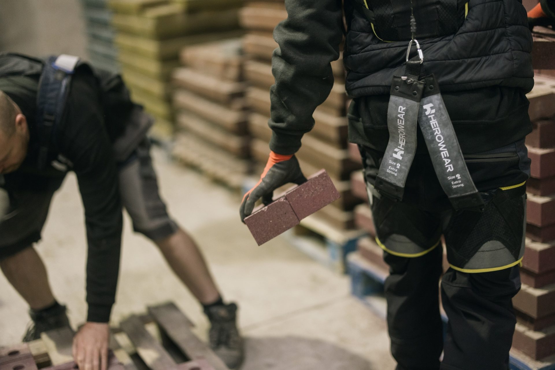 Workers lift bricks using the exoskeletons - Kenoteq is trialling two different models.