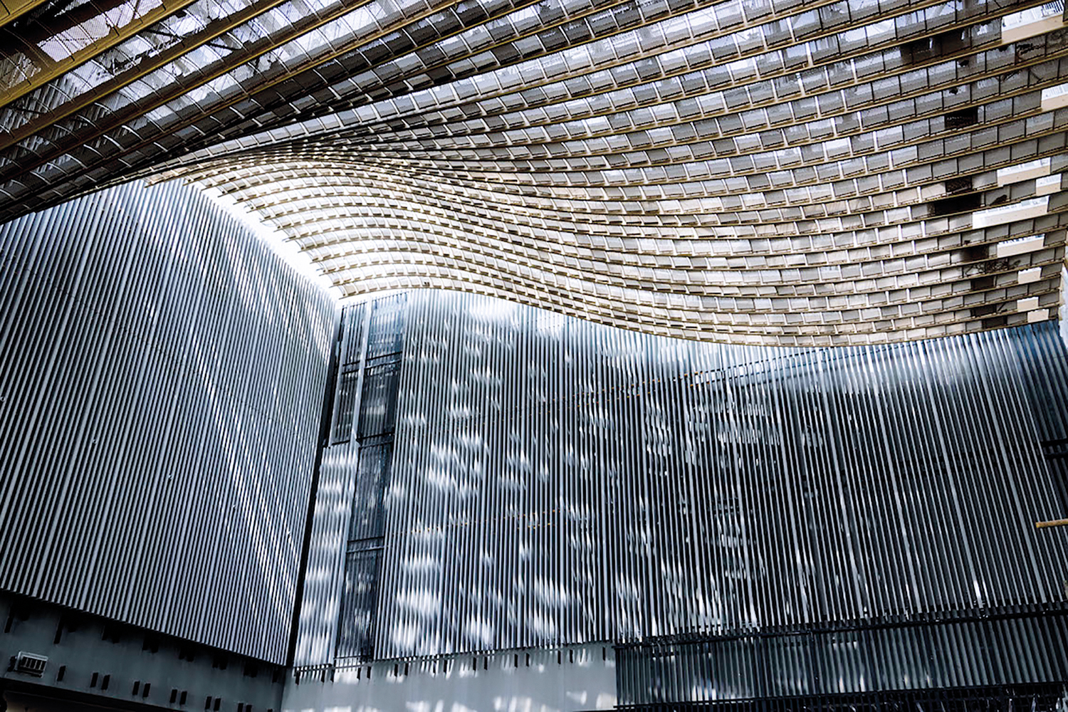 The atrium ceiling comprises 6,800 three-dimensional, curved, and perforated aluminium tiles