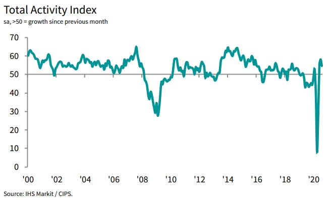 The index registered a score of 54.6 in August (where any figure above 50 indicates growth in total construction output), down from 58.1 in July.