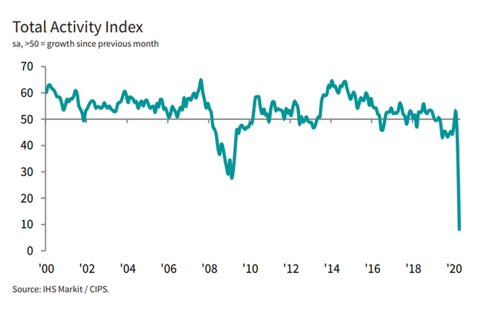 The IHS Markit/CIPS UK Construction Total Activity Index fell from 39.3 in March to 8.2 in April