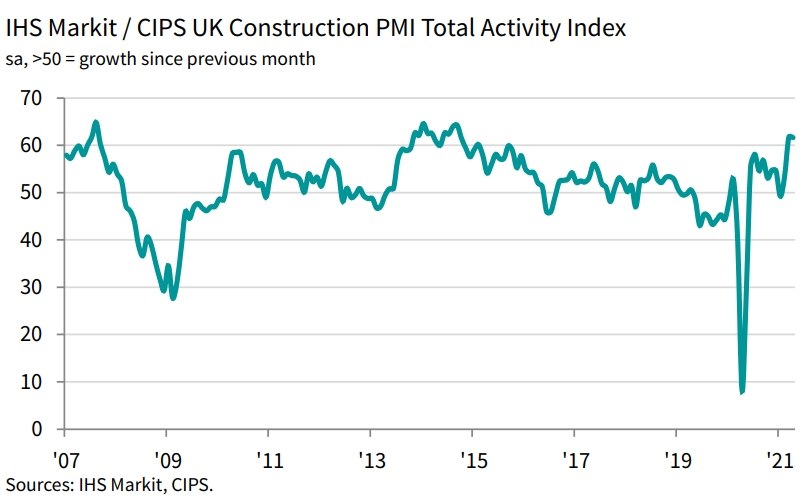 “New orders surged higher in April as the end of lockdown spurred contract awards on previously delayed commercial development projects. This added to the spike in workloads from robust housing demand and the delivery of major infrastructure programmes such as HS2.