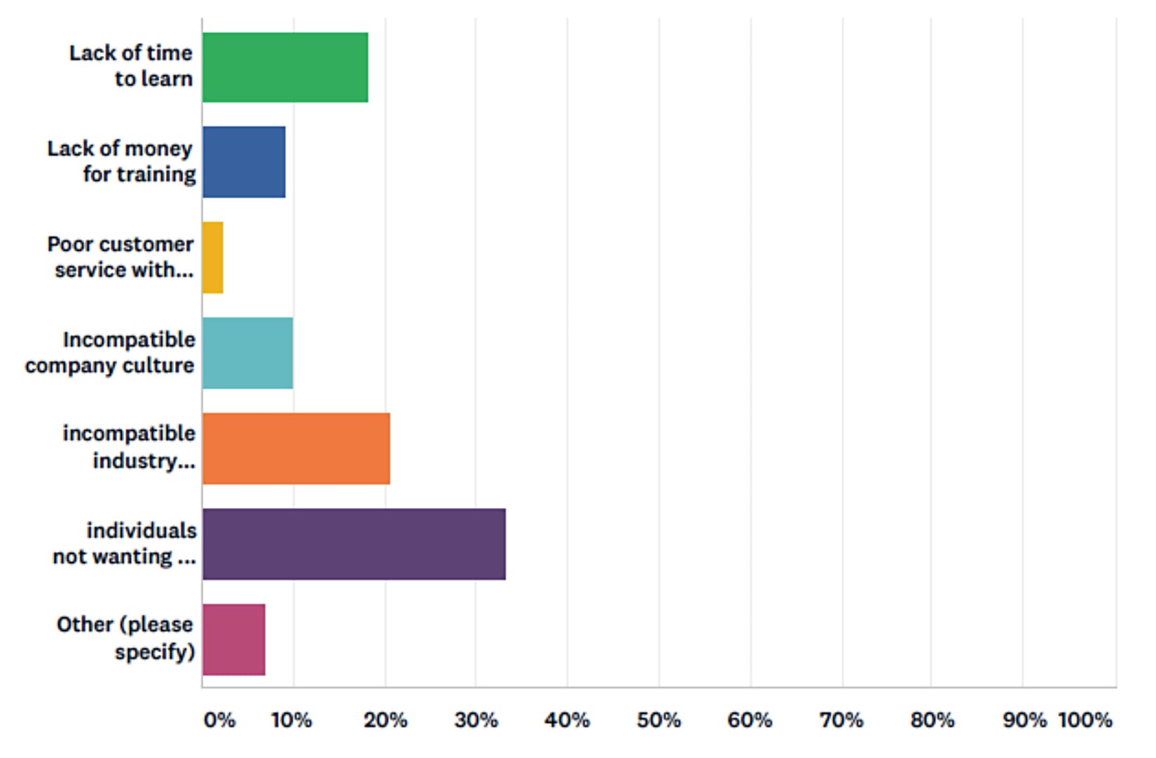 Only 18% of survey respondents cited lack of time to learn as the main obstacle and 9% said lack of money for training. A third of respondents said it was individuals not wanting to change old processes that was the main obstacle preventing adoption of new technology.
