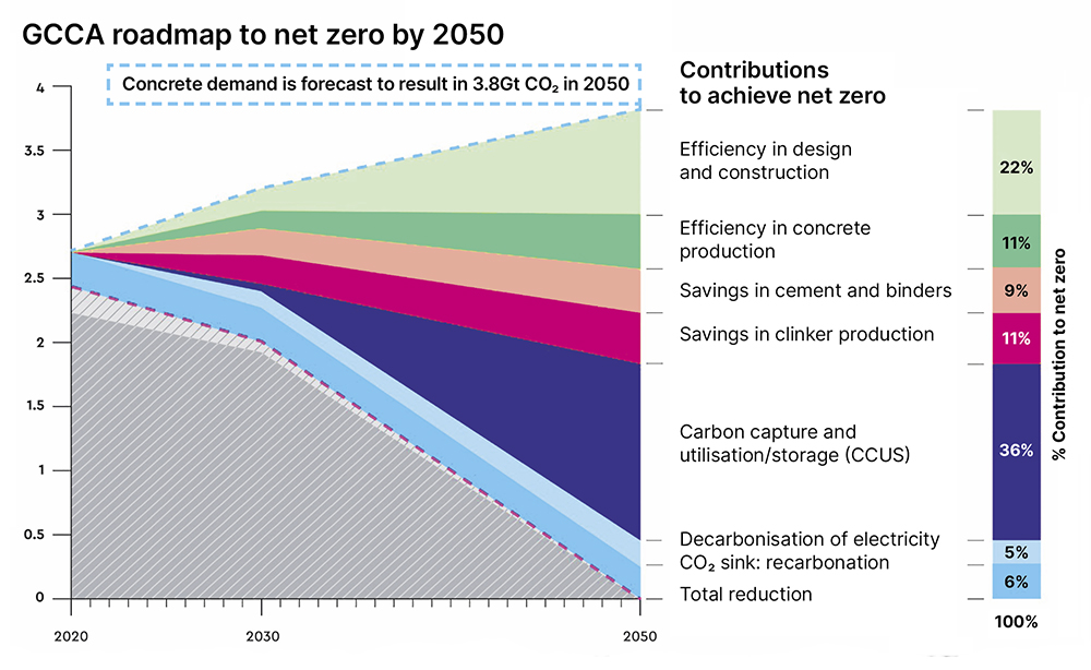 The GCCA reports a 20% proportionate reduction in CO2 emissions from cement production over the last three decades. In October, it published its roadmap to net zero in 2050 (see chart, p22), and as part of this, Minson calls on construction professionals to step up.