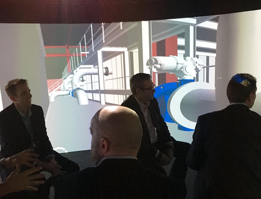 The 3D model was visualised in an Igloo shared virtual reality system, a 6.5 metre-diameter cylinder erected inside a disused building on site that enabled up to 12 team members at a time to walk around the scheme and carry out design review meetings.