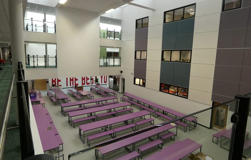 The design ethos was to provide a robust, sustainable and engaging learning environment for current and future pupils of the school. Flexible spaces were tailored to suit the school’s individual needs and included a triple-height glazed entrance atrium; the main hall and drama studio, which are connected via a five-metre high moveable wall to form the stage area; and motorised retractable bleacher seating to allow for flexible assembly, dining and performance options.