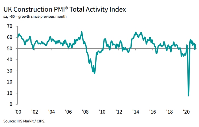 The IHS Markit/CIPS UK Construction Total Activity Index posted 53.3 in February, up from 49.2 in January (where 50 indicates no change), driven by commercial work.