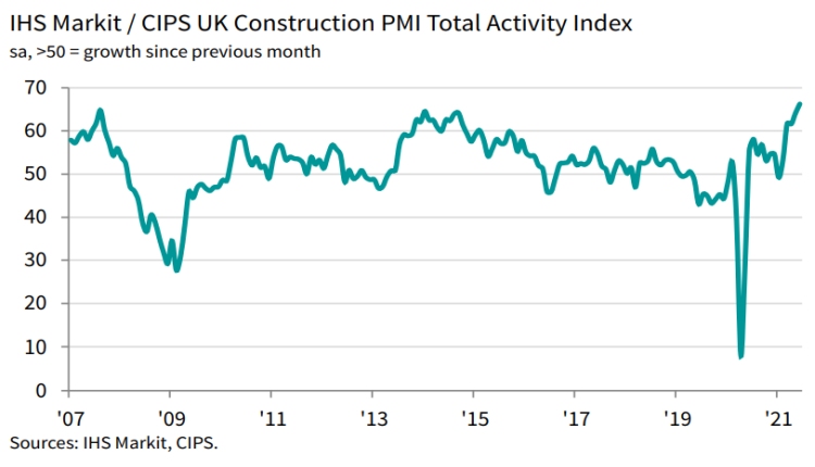 The IHS Markit/CIPS UK Construction PMI Total Activity Index registered a score of 66.3 last month (where 50 indicates no change), up from 64.2 in May. It was the highest score since June 1997, with sharp increases in activity across all three main areas of the construction sector.