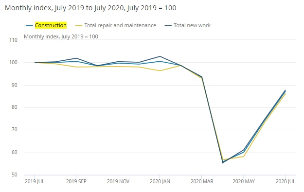 On a rolling three-month basis, the construction sector shrank by 10.6% in July, following a record 35% decline in June. The largest contributors to the fall were private new housing and private housing repair and maintenance, which fell by 17% and 17.9% respectively, according to the Office for National Statistics.