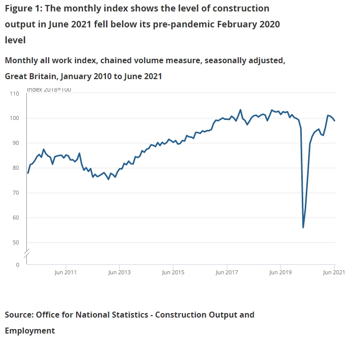 The Office for National Statistics reported that June output was 0.3% below the February 2020 pre-coronavirus pandemic level. New work was 2.1% below the pre-pandemic level, while repair and maintenance was 3.1% above.