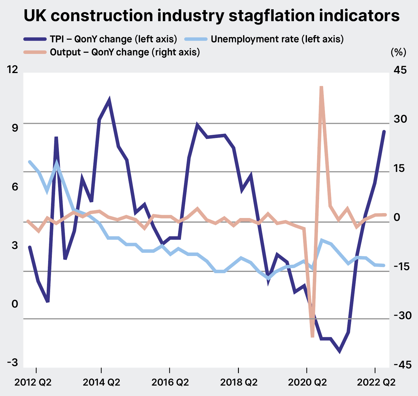 The figures may be cause for concern. But they don’t alone signal a period of stagflation across the construction industry – for now at least. Construction output remains robust, rising in Q2 2022 by 2.3% on the quarter. In addition to this high output, unemployment is low, getting back to pre-pandemic levels.