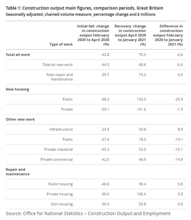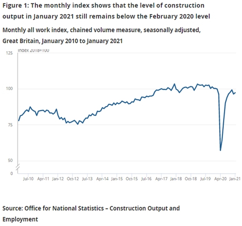 But the Office for National Statistics (ONS) also revealed that the January 2021 level of output was still 2.6% below the pre-pandemic level recorded in February 2020. New work was 6.4% below this level, although repair and maintenance was 4.5% above, despite a monthly fall.