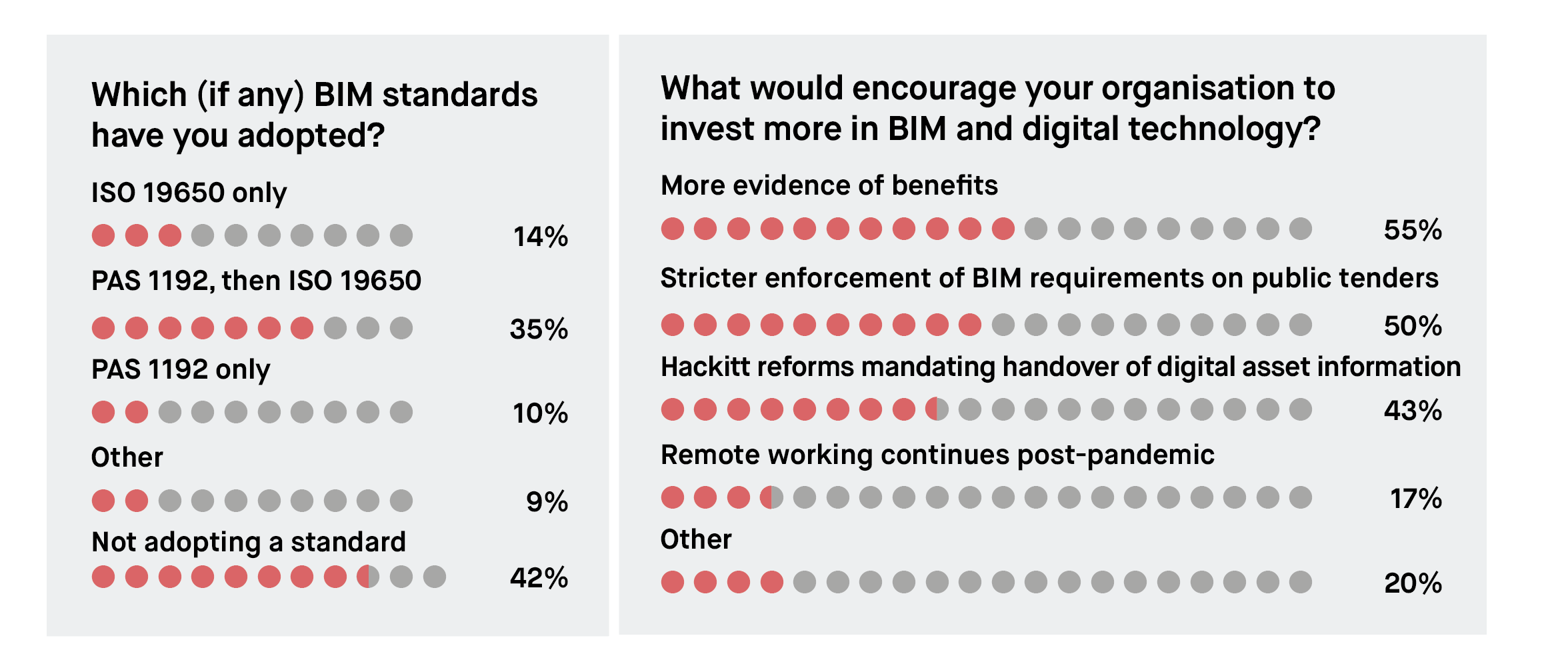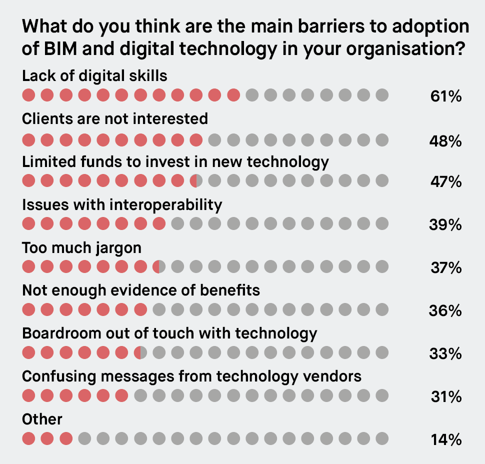 Intriguingly, the lack of evidence of the benefits is less frequently cited as a barrier to the adoption of BIM and digital technology: the percentage of respondents citing lack of evidence as a blocker dropped to 36% from 45% in last year’s survey.