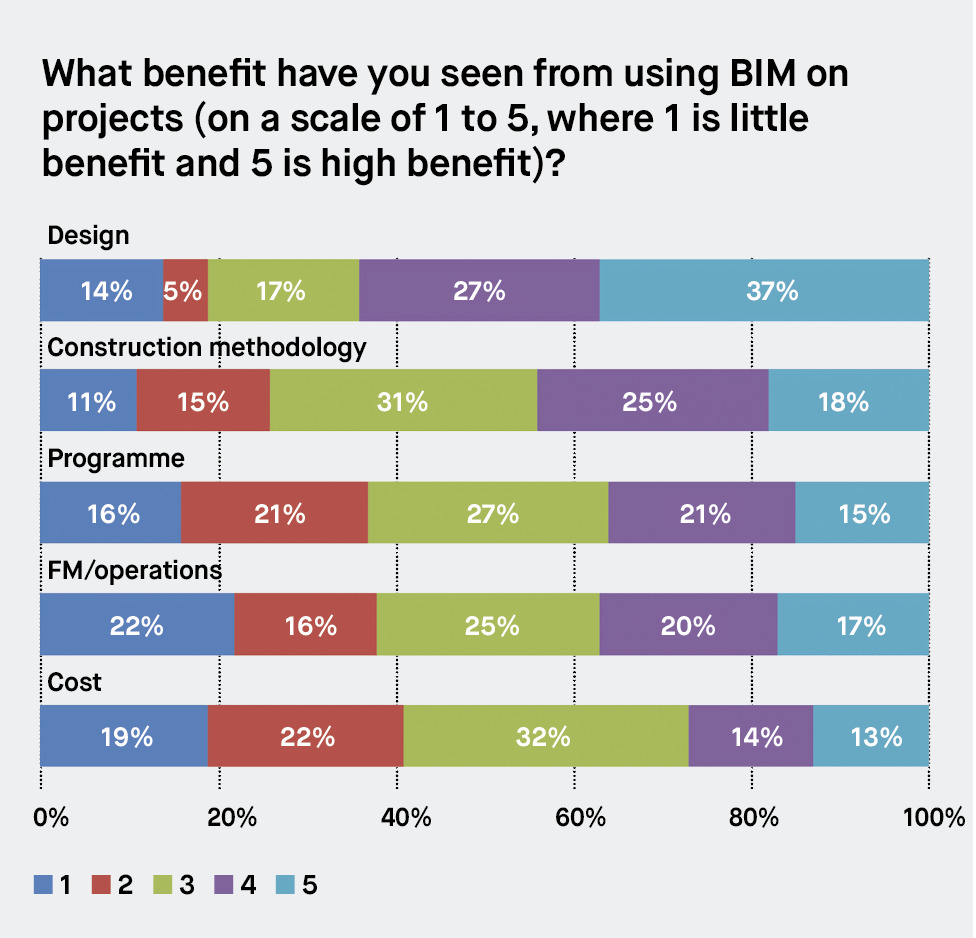 Design is the area that respondents are seeing the most improvement in thanks to BIM. More than a third (43%) also cited benefits in construction methodology (down from 44% last year). Benefits were also apparent in programme (36%, down from 39%), FM and operations (37%, up from 34%), and cost (static year on year at 27%).