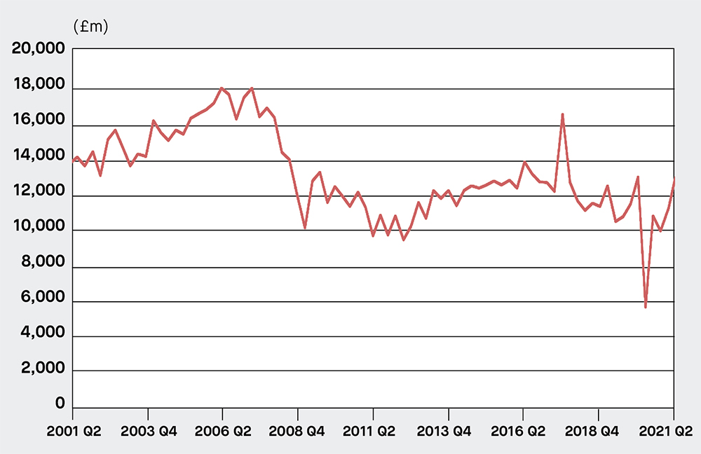Recent Office for National Statistics (ONS) data shows new orders rising significantly, increasing by 17.6% on the quarter and 135.2% on the year as of Q2 2021 as demand climbs out of its pandemic trough at pace. It’s worth bearing in mind that this is from a much lower base than even during a global recession such as 2008, and shows a rapid return of investor appetite.