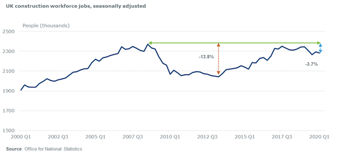 As of Q1 2020, construction workforce jobs remained -3.7% below the peak seen prior to the 2008/09 recession. In simple terms, jobs that were cut directly after the global financial crisis still had not returned before the covid-19 recession gripped the UK.