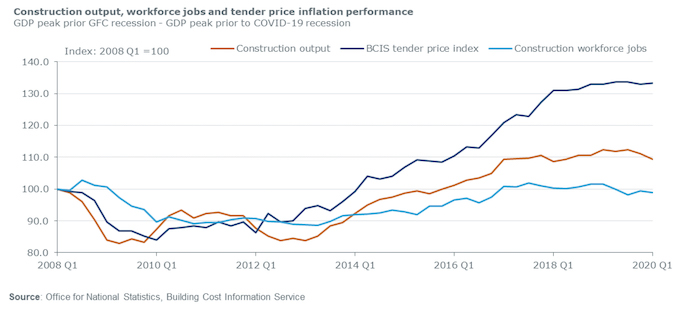 After construction output started to accelerate from 2013 Q1, employment and pricing diverged. Tender price inflation increased by 39.3% over the next five years as workloads increased and employment levels remained stubbornly low. Companies hesitated when making hiring decisions, fearful that green shoots of recovery may not take root, and jobs growth increased by just 13% in comparison.