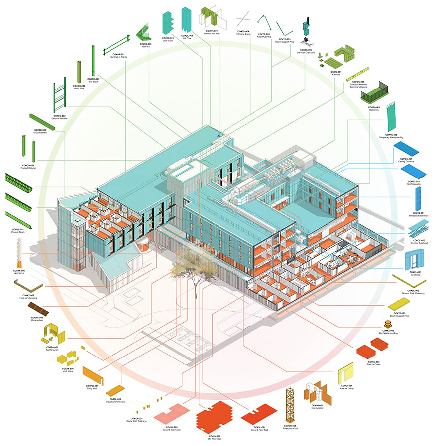 A “colour wheel” shows the breakdown of components in a recent Bryden Wood project, showing which are client-specific DfMA, which are existing products from the supply chain and which are site supplied