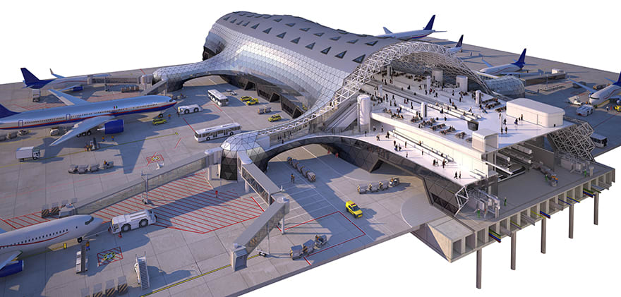 The entire 743,000 sq m terminal is enclosed within a continuous lightweight spaceframe structure, combining walls and roof in a single, double curved flowing form, evocative of flight.