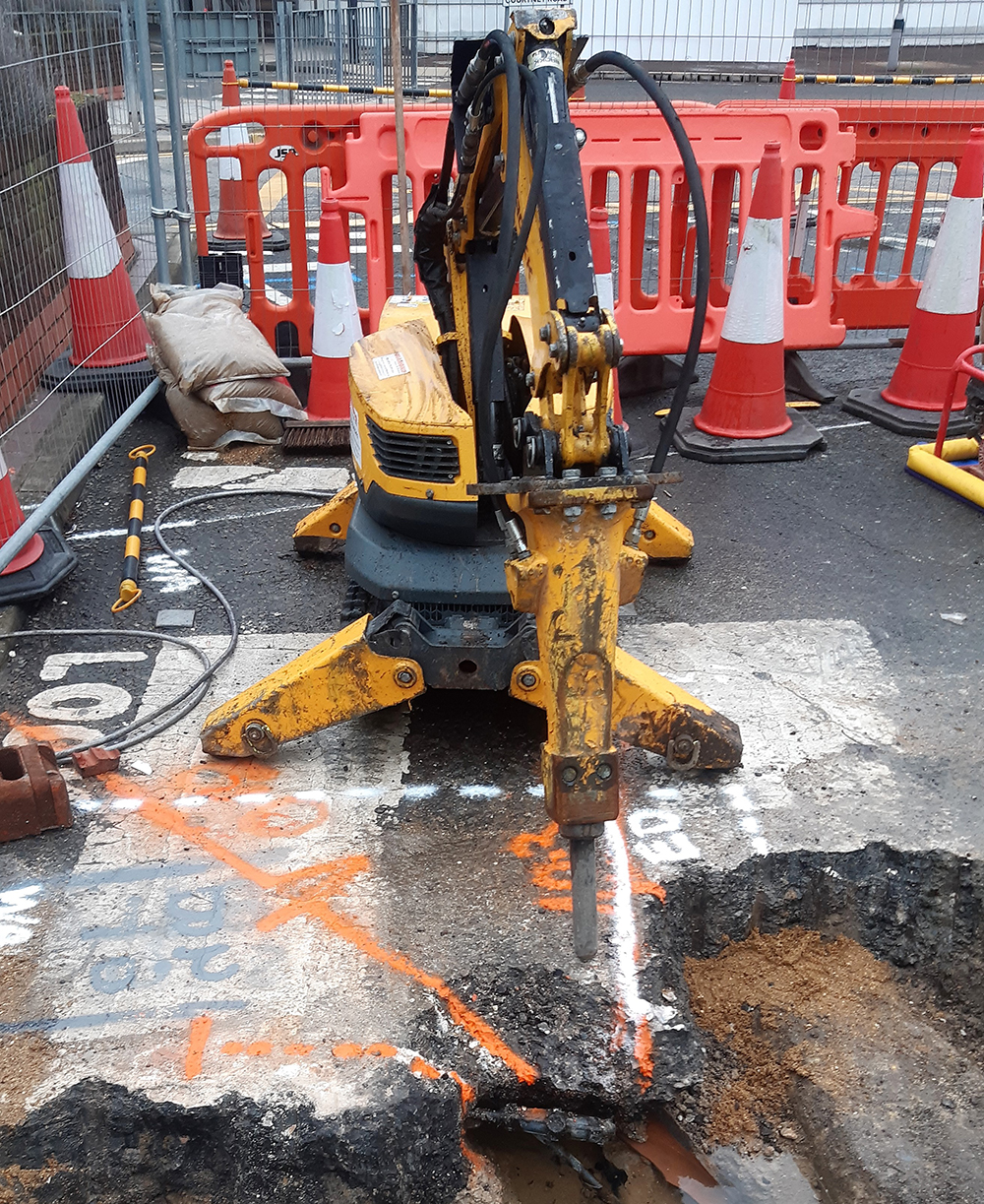 Breaking up the surrounding layers of asphalt and concrete to further expose and identify the potentially ‘live’ cable posed a significant safety risk: the central terminal area is full of identified buried services including “high temperature hot water” pipes, electrical feeds to structures, street furniture and traffic loops.
