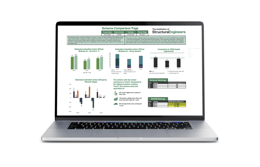 The Excel-based tool enables users to quickly estimate the embodied carbon in their structure and allows comparison of up to six options at once. It can be used to locate embodied carbon hotspots in a design, allowing a focused approach to reducing it.