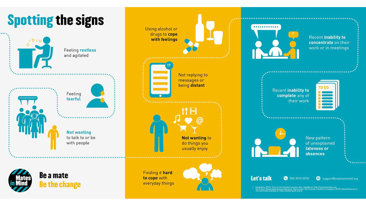 If you are ready to start the conversation within your organisation, we have a number of free resources available on the Mates in Mind website, including the infographic shown here, which helps identify if a colleague needs support.