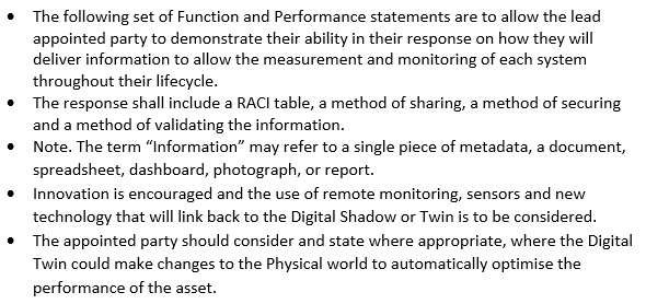 The information requirements are based around a series of function and performance statements that will allow the lead appointed party to generate, manage, share and provide assurance using their best methods, procedures and technologies.