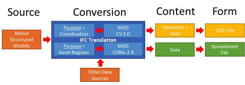 The figure below illustrates how IFC (as a schema) is needed for the translation of project data to make its way to COBie in the spreadsheet format, because COBie is a subset of the whole IFC schema (it doesn’t contain everything but contains a lot of the data found in “Coordination View”, only with the geometry and NA relationships stripped out to support the model view definition’s [MVD] purpose).