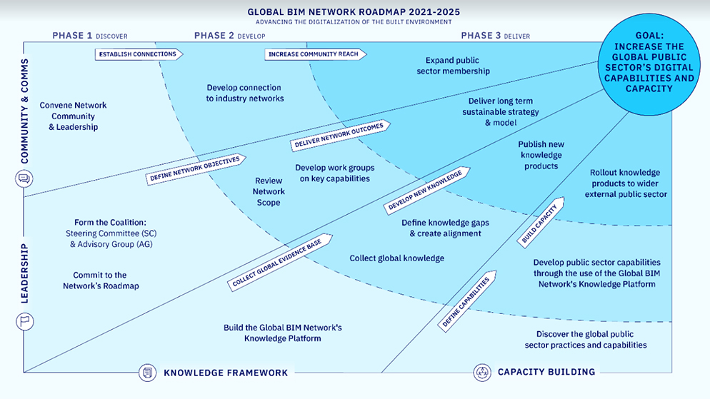 The Global BIM Network Roadmap 2021-2025 aims to promote collaboration between the public sector and industry on digitalisation and has been co-created by a range of organisations internationally – across the public sector, funding, and more – through the network.