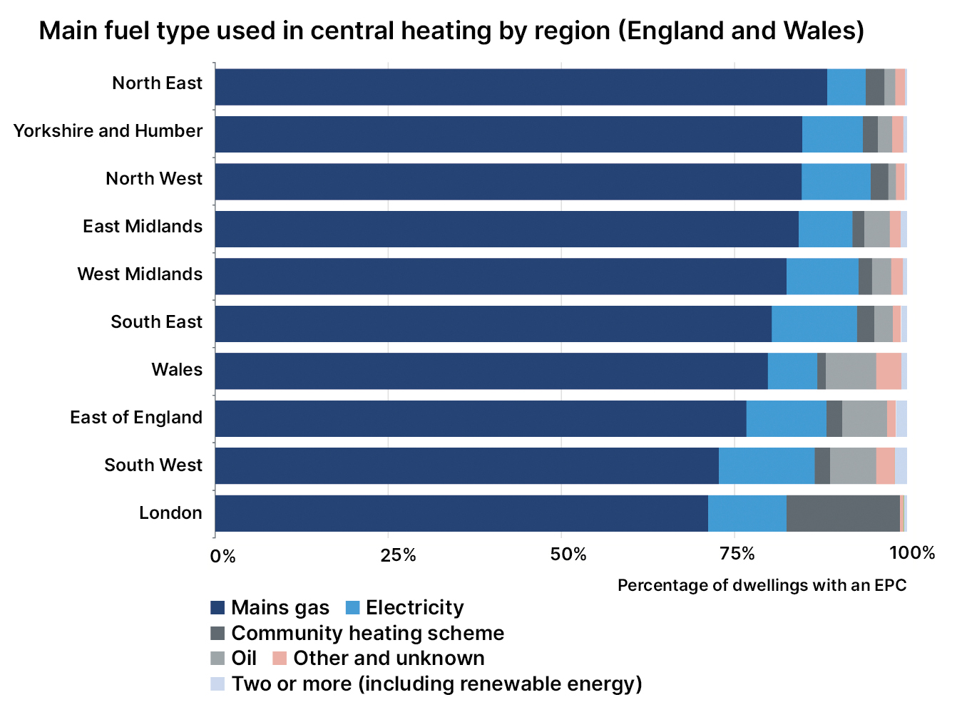 To reduce this and reach our 2050 net zero target, the nation needs to urgently decarbonise UK heating systems. No UK region has more than 0.07% of homes heated solely by renewable methods.