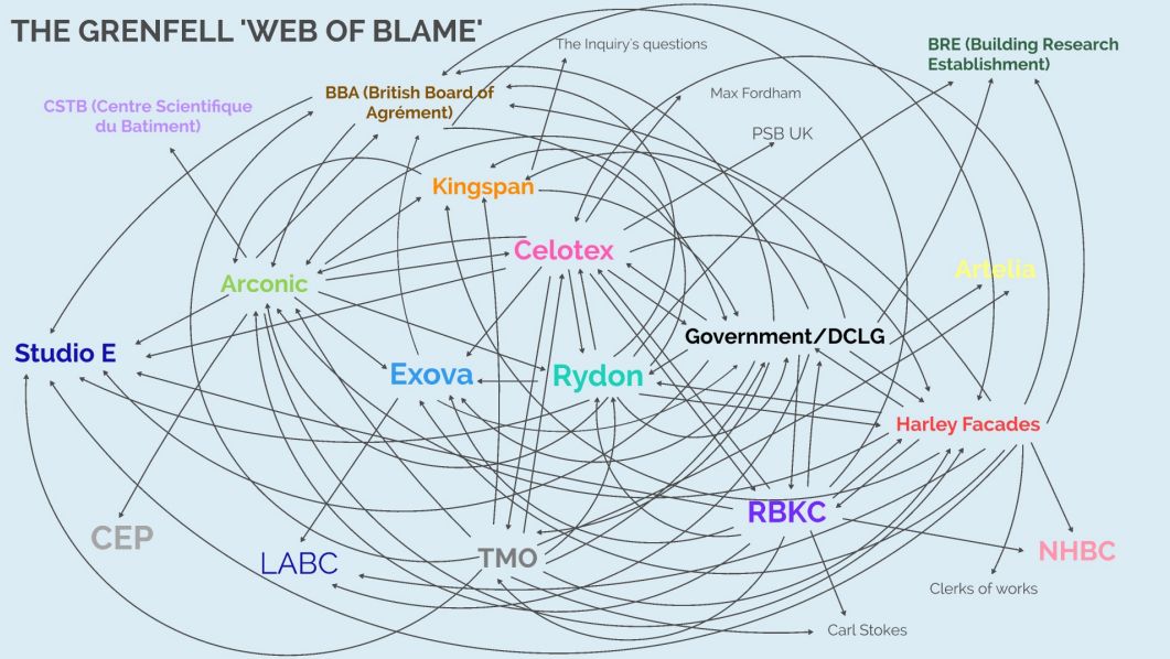 Millett produced a presentation to map out the “spider’s web of blame” (above). The diagrams set out the names of the companies and organisations involved in the refurbishment with arrows pointing to the organisations to which they have apportioned blame during the Inquiry, creating a dense web.