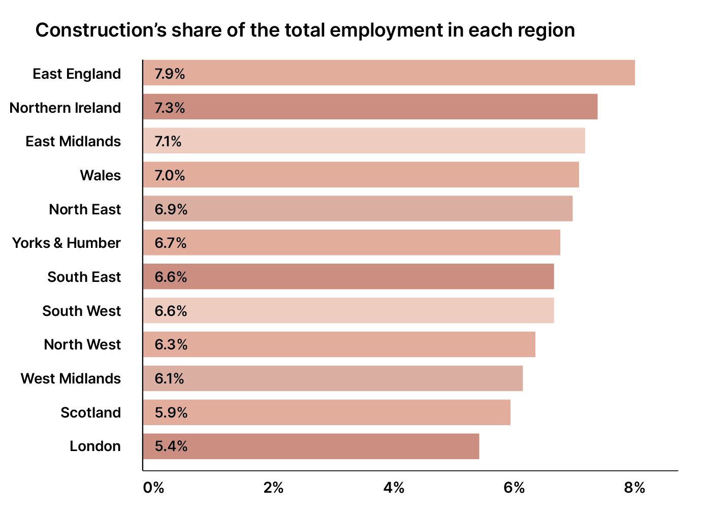 The East of England has the highest proportion of its workforce engaged in the construction sector. At 7.9% in 2022, this compares with 5.4% in neighbouring London. But a large cohort of workers from the East will travel to work on projects in London.