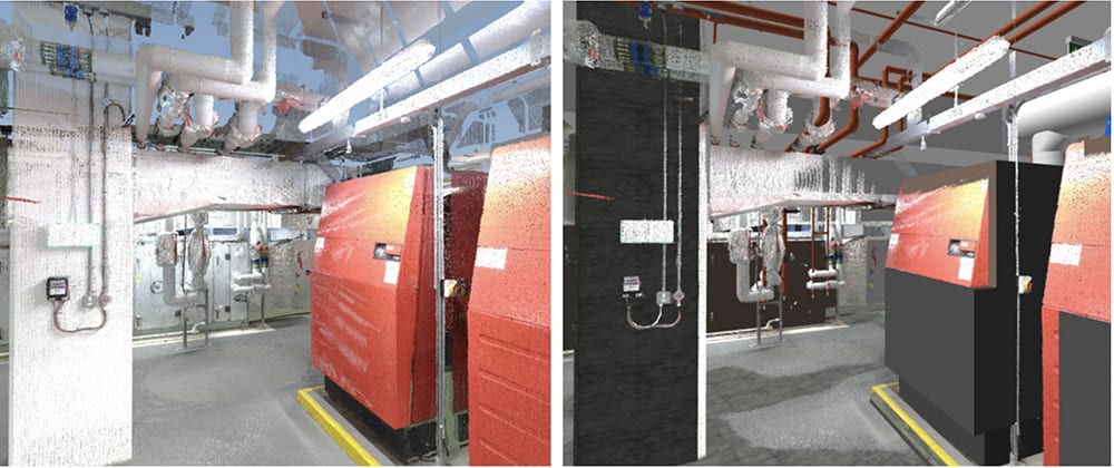 The image on the left shows the point cloud and the one on the right has the point cloud overlaid on the model. You can clearly see issues with the pipe coordination at high level